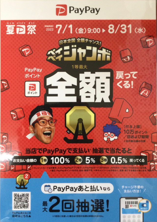この夏! PayPayでお買い物をして頂くと ポイントで全額戻ってくるチャンス! PayPayあと払いなら最大2回抽選!! 1等 100% 2等 5% 3等 0.5% この機会をお見逃しなく(≧▽≦)! ※開催期間 7/1(金)~8/31...