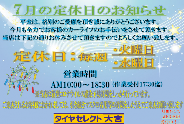 皆様、車検切れに注意ですよ~! 画像のシールがお車に貼ってある方は 7月で車検が切れてしまいます・・・(;´Д`) 大宮店では車検を行っておりますので タイヤ点検のついでに見積もりだけでもいかがですか!? ...