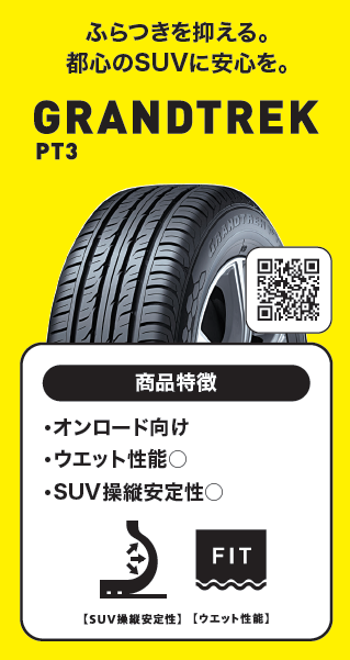 「ダンロップ GRANDTREK PT3」ですよ~~ ↑SUV向けタイヤです!(^^)! 街乗りがメイン!でSUVにお乗りのお客様必見!! オンロード(街乗り)に必要な、走行の安定性とウェット性能を高めたダンロップのタイヤとなっ...