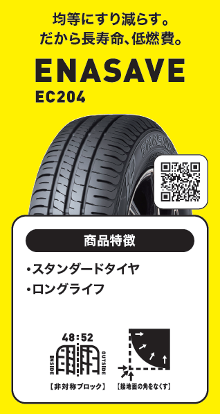 「ダンロップ ENASAVE EC204」について紹介しますよ~! このタイヤは長寿命かつ低燃費なタイヤです! 主な特徴としては、角が丸みを帯びているので接地面の「角」にかかる圧力を分散!! つまり均一に摩耗するのです!...