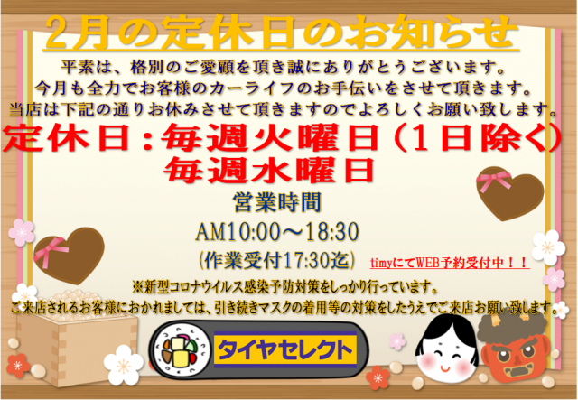 こんにちは! タイヤセレクト大宮です。 【2月定休日のお知らせ!!】 毎週火曜日(1日を除く)・水曜日 が定休日となります。 営業時間はAM10:00~PM18:30 作業受付は17:30迄 ※作業は予約制となっております。 ...