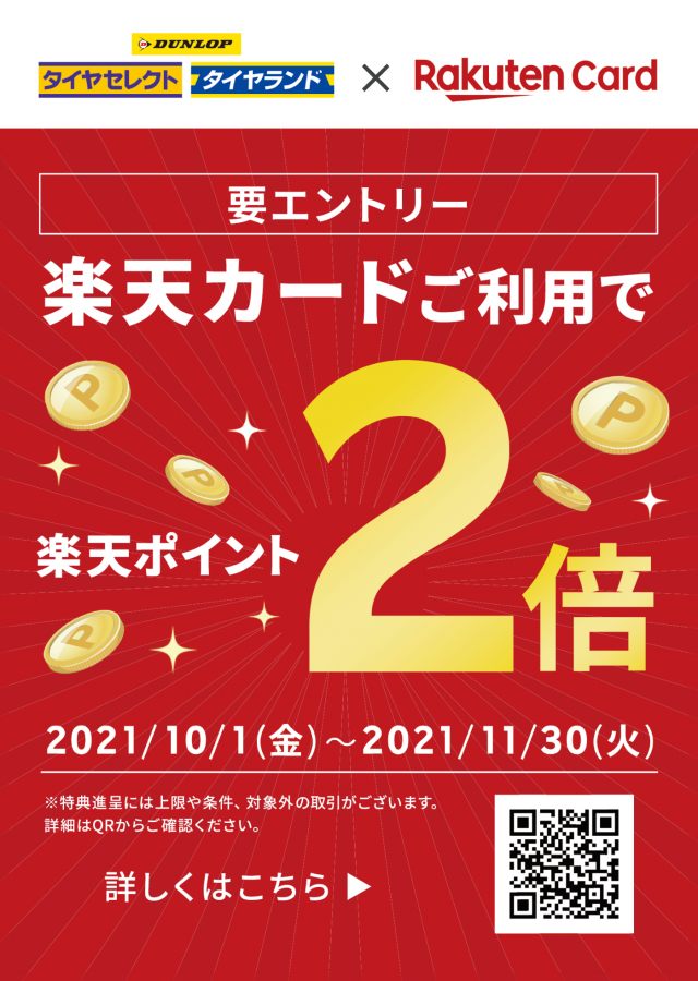 こんにちは! タイヤセレクト大宮です! 【楽天カードをご利用のお客様に朗報です!!】 明日10月1日~11月30日の 期間限定で ポイントが2倍!! まずは楽天からエントリー!!