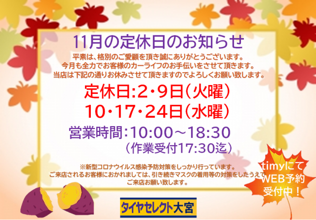こんにちは! タイヤセレクト大宮です。 【11月定休日のお知らせ】 2・9日の火曜日 10・17・24日の水曜日 が定休日となります。 営業時間はAM10:00~PM18:30 作業受付は17:30迄 ※作業は予約制となって...