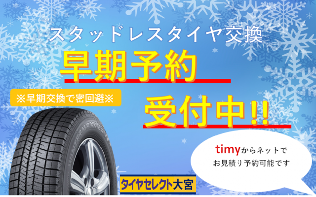 こんにちは! タイヤセレクト大宮です! 10月も下旬になり、肌寒くなってきましたね。 北海道では、初雪が観測されスタッドレスのシーズンが到来です! 当店では、 【早期予約受付中!】 以下のことでお困りで...