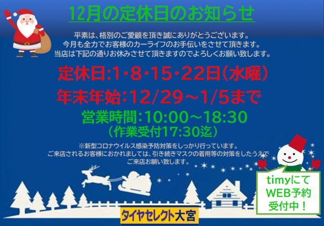 こんにちは! タイヤセレクト大宮です。 【12月定休日のお知らせ】 1・8・15・22日の水曜日 【年末年始休業のお知らせ】 12月29日~1月5日まで が定休日となります。 営業時間はAM10:00~PM18:30 作業受付は17:3...