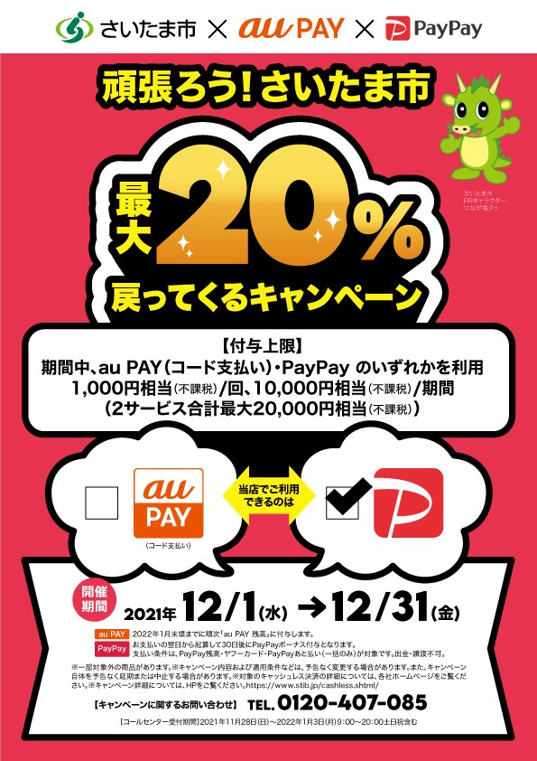 こんにちは! タイヤセレクト大宮です! PayPayをご利用のお客様に朗報です! 12月1日(水)~12月28日(火)までの期間中 当店でPayPay残高でお支払いしますと なんと最大20%戻ってくる 「さいたま市のキャンペー...