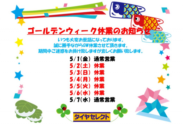 GWの休業日のご案内です 5/1(金) 通常営業 5/2(土)~5/6(水) 休業日 5/7(木)~ 通常営業 お客様にはご不便をおかけいたしますがよろしくお願いいたしますm(_ _"m)