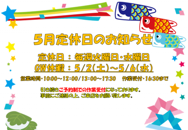 GWの休業日のご案内です 5/1(金) 通常営業 5/2(土)~5/6(水) 休業日 5/7(木)~ 通常営業 お客様にはご不便をおかけいたしますがよろしくお願いいたしますm(_ _"m)