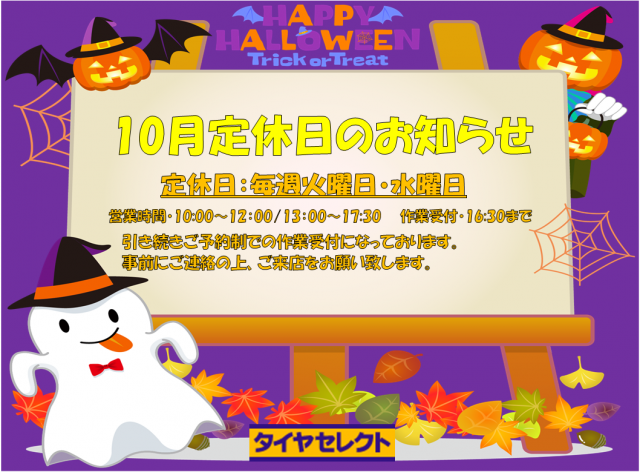 こんにちわっ☆彡 タイヤセレクト浦和店です! 10月の定休日は毎週火曜日・水曜日になります。 作業に関しましても引き続き予約制になりますので、事前のご予約を宜しくお願い致します!