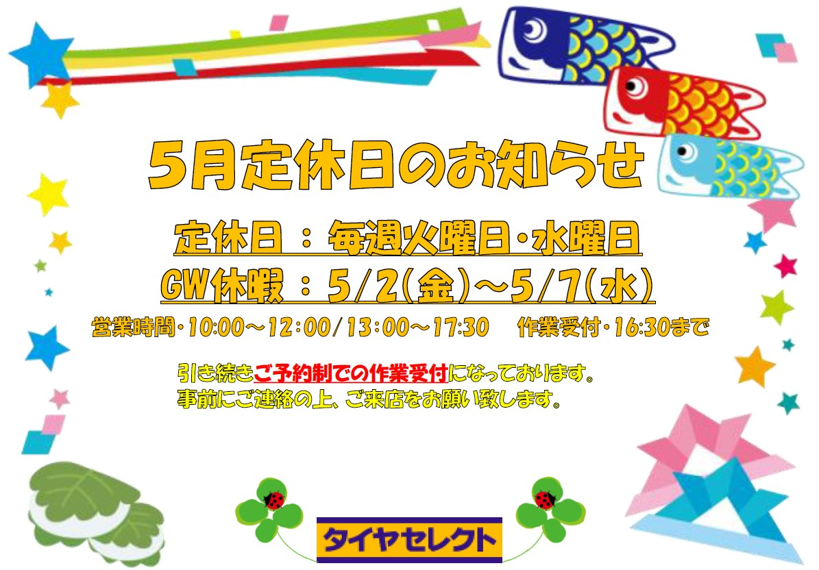 5月定休日のご案内 こんにちわっ☆彡 タイヤセレクト浦和店です! 5月の定休日は毎週火曜日・水曜日+GW休暇になります。 作業に関しましても引き続き予約制になりますので、事前のご予約を宜しくお願い致します! 2025.04.29