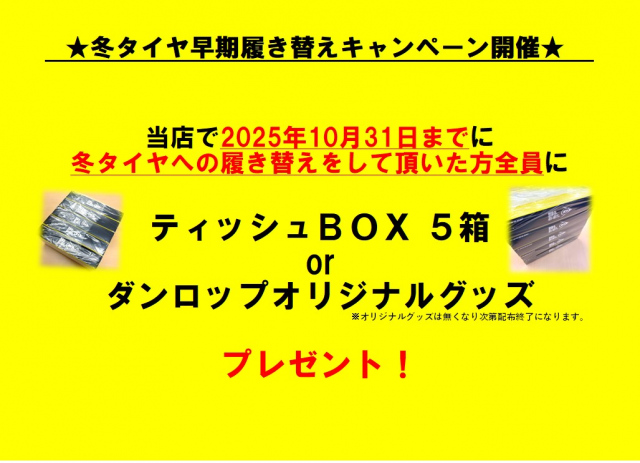 して頂いたお客様全員に“ティッシュBOX” もしくは ”ダンロップオリジナルグッズ”を