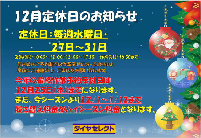12月定休日のご案内 こんにちわっ☆彡 タイヤセレクト浦和店です! 12月の定休日は毎週水曜日・27日~31日になります。 年内最後の通常営業日は12/25(木)になります。 早めのご予約をお願いいたします。 2025.11.30