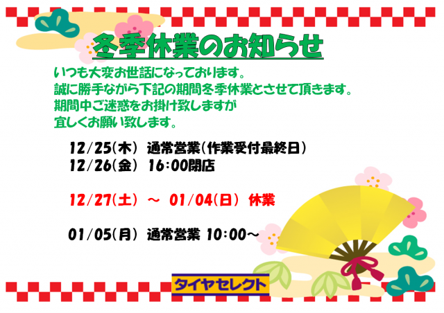 冬季休業のご案内 こんにちわっ! タイヤセレクト浦和店です! 誠に勝手ながら12月27日(土)~1月4日(日)まで冬季休業させて頂きます。 期間中ご迷惑をお掛け致しますが、宜しくお願い致します。 2025.11.30