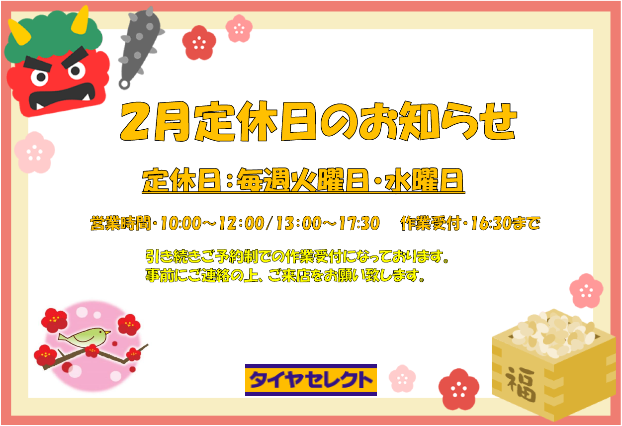 2月定休日のご案内 こんにちわっ☆彡 タイヤセレクト浦和店です! 2月の定休日は毎週火曜日・水曜日になります。 作業に関しましても引き続き予約制になりますので、事前のご予約を宜しくお願い致します! 2026.01.31