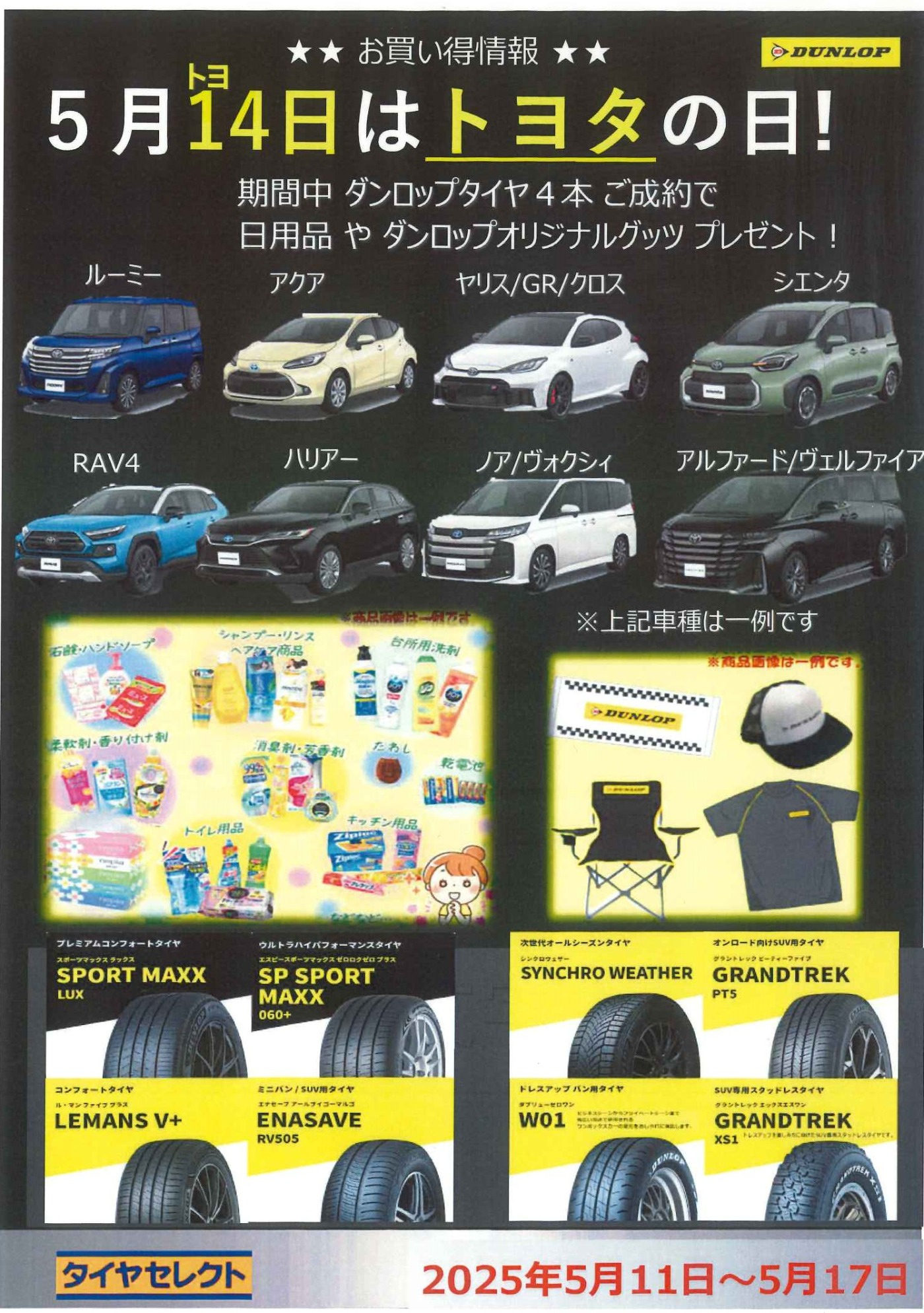 5月14日はトヨタの日(当店の勝手です)それにちなんで5/11(日)より5/17(土)の期間にトヨタ車でダンロップタイヤ4本ご成約の方にダンロップグッズや日用品を