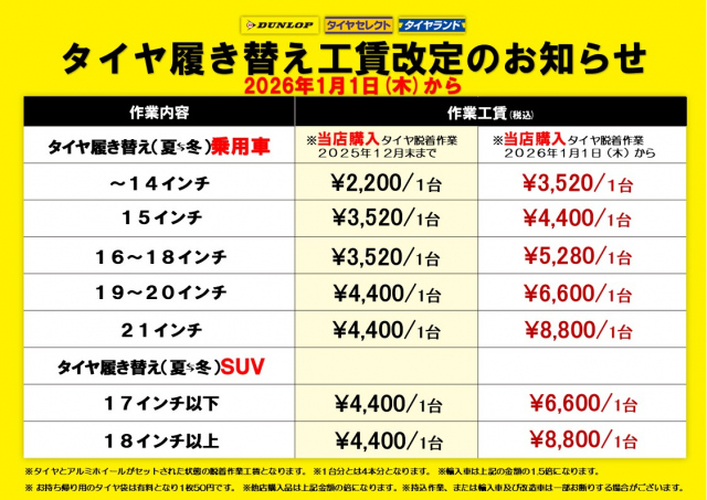 2026年1月1日より シーズンタイヤの履き替え工賃を改定しました! ご不明な点などがございましたら、当店スタッフまでお問い合わせください。
