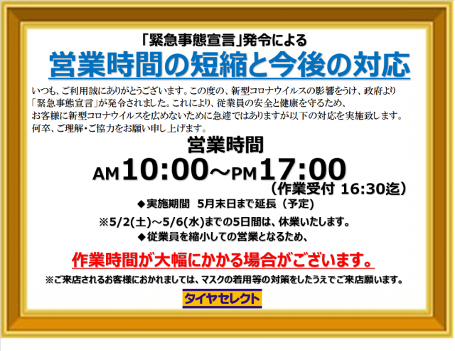 タイヤセレクト川越店です。GWと5月の定休日のご案内です。