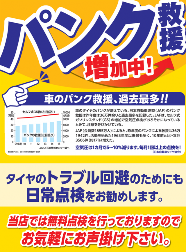 当店でも無料のタイヤ点検実施中ですのでお気軽にご来店ください。