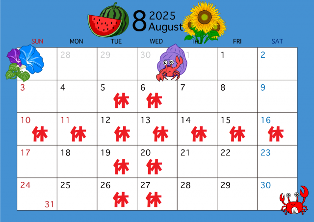 8月も火曜水曜日が定休日となりますのでお気を付けください('◇')ゞ また 8月10日(日)~8月16日(土) までを夏季休業とさせていただきます(^^♪ みなさまにはご不便をお掛けいたしますが、何卒ご理解のほどよ...