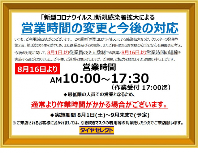本日1日㈯から少人数での営業、夏季休業明けの16日㈰から短縮営業となる運びとなりました( ゚Д゚)