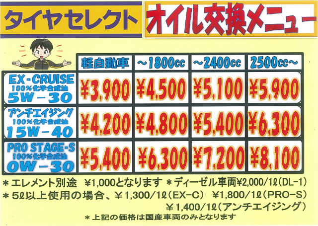 《オイル交換価格改定とメニュー内容変更のおしらせ》 エンジンオイルの仕入れ価格上昇により、 現状の金額の維持が難しくなってしまいました。 御理解の程、重ねてお願い申し上げます。 以下、4月1日からのオイル交換メニュー表です。 2025.02.16