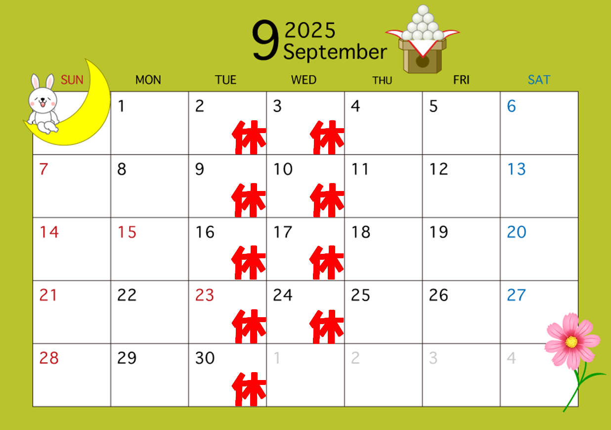 9月定休日のお知らせ お盆が過ぎてもこの猛暑\(゜ロ\)(/ロ゜)/ この先もまだまだ暑さは続くそうなので、十分気を付けていきましょう! 9月の定休日になります! 火・水曜日が定休日になります お間違えの無いようお願い致します(^O^)/ 2025.08.24