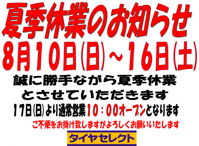 夏季休業のお知らせになります! 8/10(日)~16日(土)の7日間、夏季休業となります 17日(日)より通常営業10:00オープンとなります ご不便をおかけ致しますがよろしくお願いいたします!