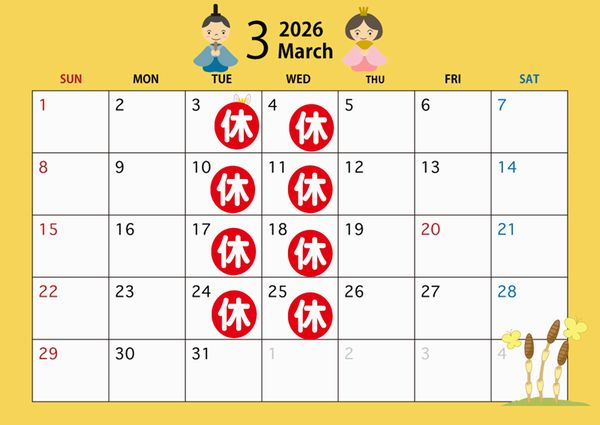 毎週水曜日 不定期火曜日(春3.4.冬11.12月は除きます。カレンダーで確認お願い致します)