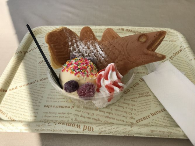 シーラカンスの形をしたパンケーキは中にバナナが入っており、今まで食べたことのない味でした。