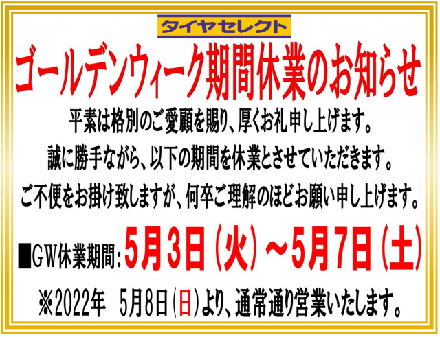 5月は GW期間休業が5/3(火)~5/7(土)となっております。