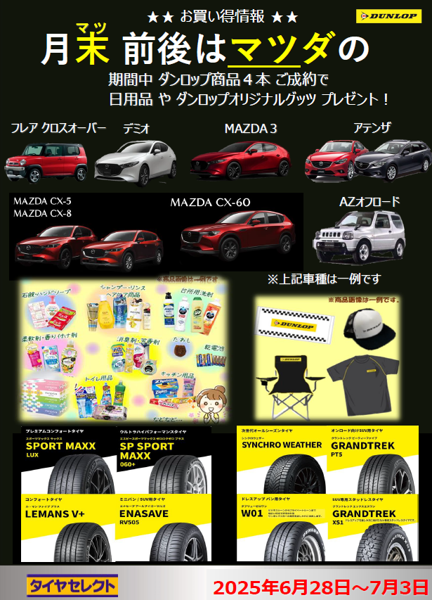 毎月月末近くはマツダの日 こんにちは♪タイヤセレクト入間です♪ 毎月月末近くはマツダ(末だ)の日です♪ 期間:6月28日~7月3日 タイヤ4本ご購入で素敵な日用品プレゼントさせていただきます♪ 是非是非ご来店ください!! 2025.06.02