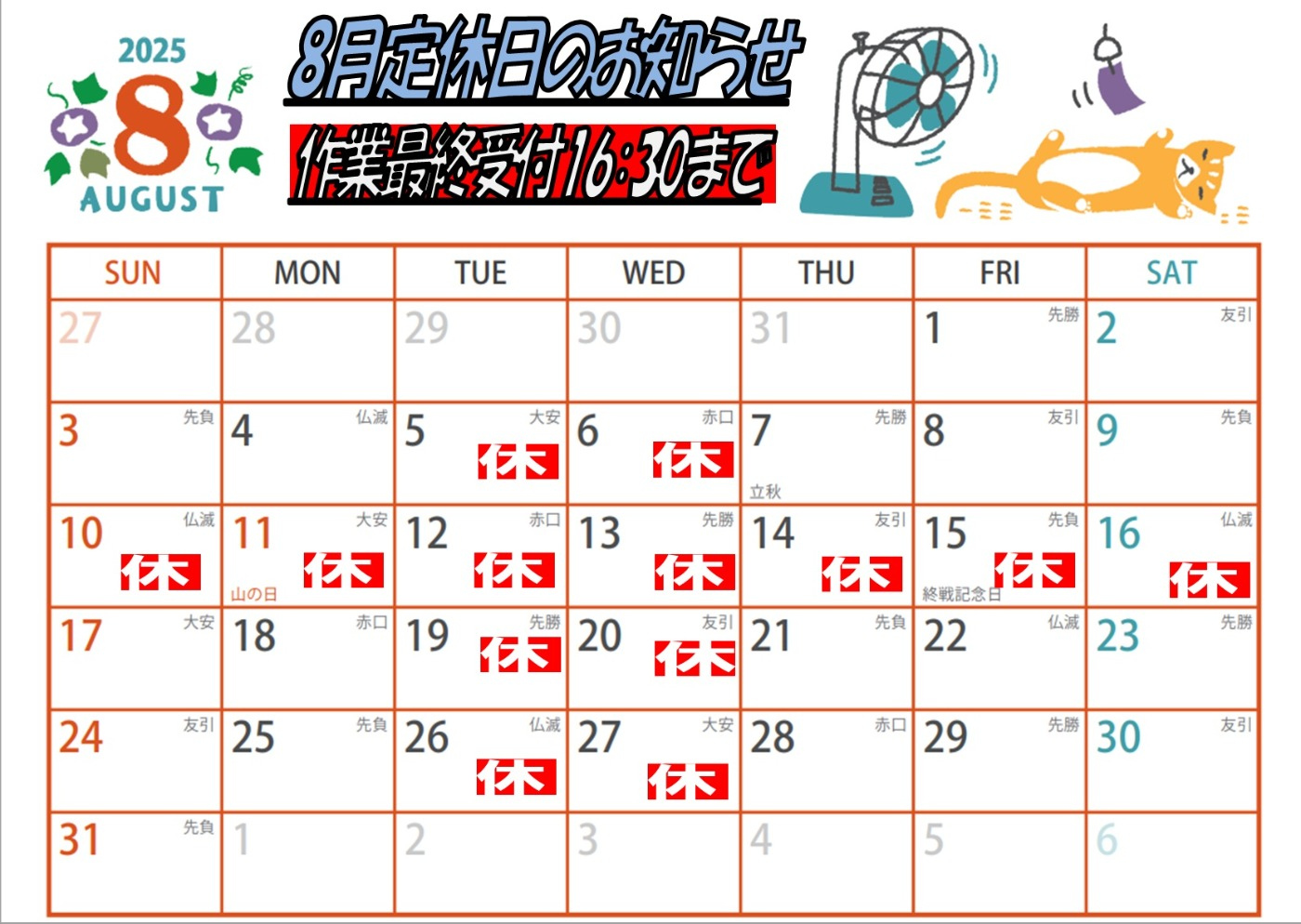 8月店休日は毎週火曜、水曜日に加え 10日(日)~16日(土)まで夏季休業とさせていただきます。 お出かけ前の点検などにもぜひご利用くださいませ(*'▽')