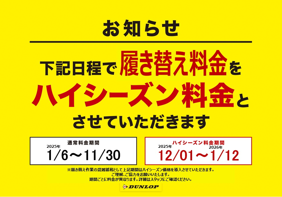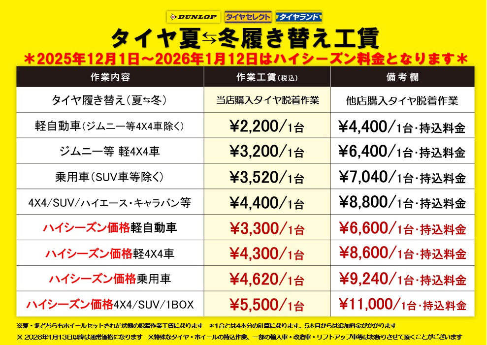 ハイシーズン料金のお知らせ(再掲) 履き替え作業混雑緩和のため 2025年 12/1~ 2026年 1/12の期間 ハイシーズン料金でのご対応となります。 軽4×4の料金も価格改定となっておりますので ご確認よろしくお願いいたします。 2025.12.01