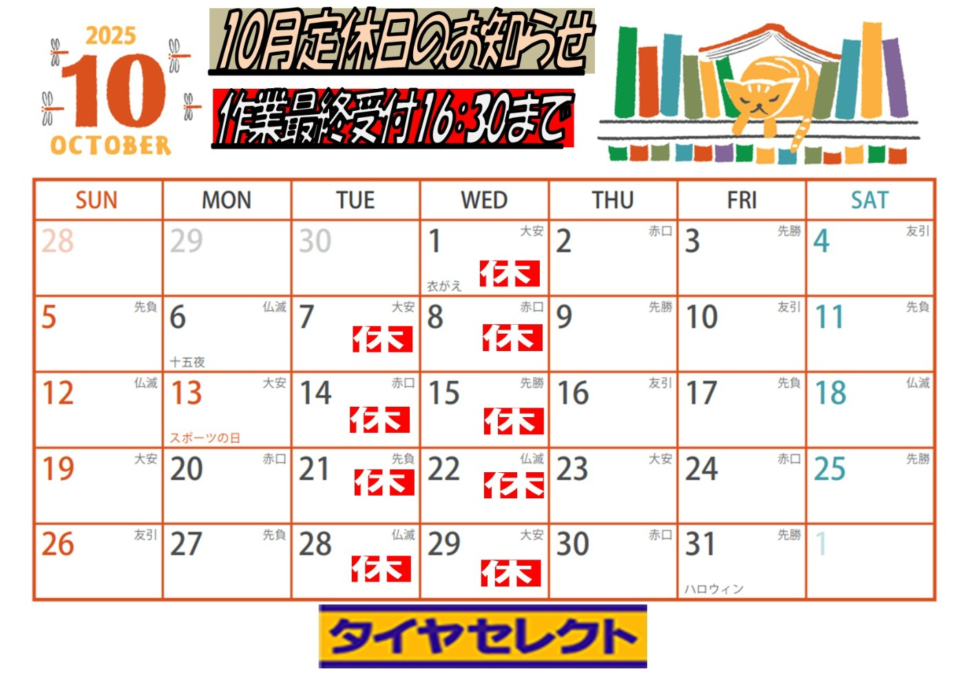 10月の店休日は毎週火曜、水曜日となっております。 お出かけ前の点検もお気軽にご来店くださいませ( *´艸`)