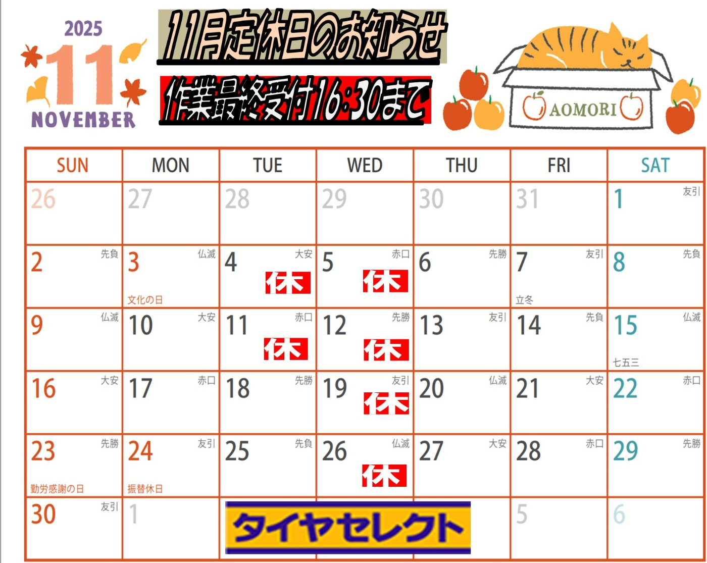 11月店休日のお知らせ 11月店休日は毎週水曜日と第一第二火曜日となっております。 12月より履き替え料金がハイシーズン料金となりますので 早期装着をおすすめいたします_(._.)_ 2025.10.31