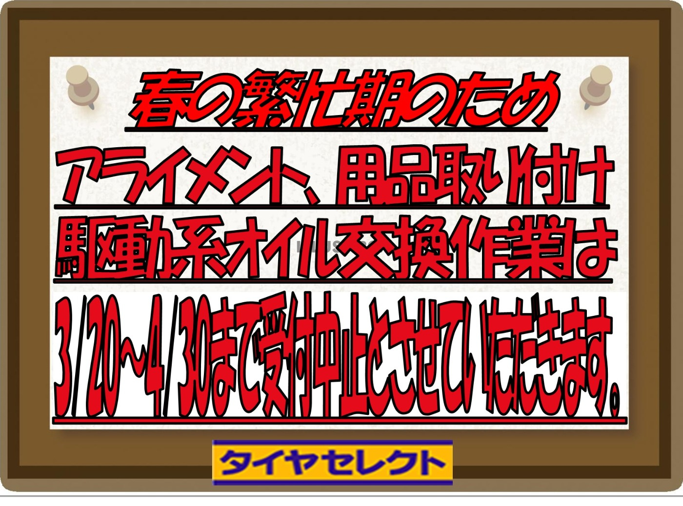 タイヤ脱着作業による繁忙期となるため アライメントや駆動系オイル交換の作業を一時休止させていただきます。 よろしくお願いいたします。