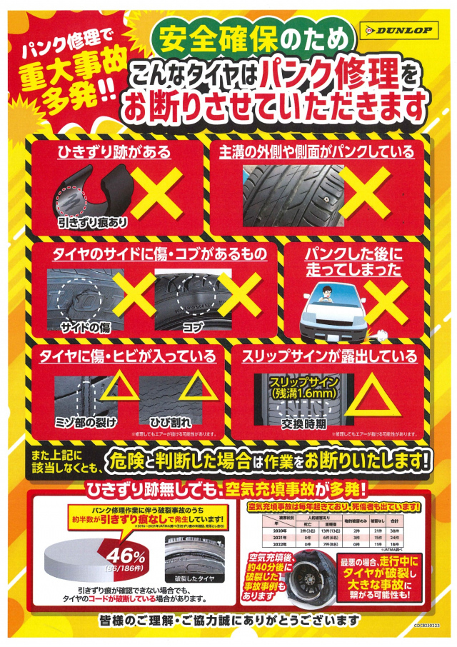 パンク箇所やタイヤの状態によっては、 パンク修理をお断りする場合が御座います。 少しでも低空気圧で転がしてしまうとホイールと路面に挟まれて、 タイヤ側面(サイドウォール部)に数百kgの重さで押しつぶされま...