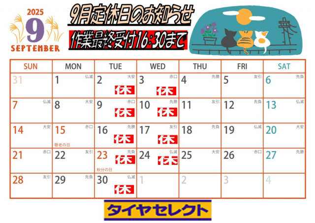 8月店休日は毎週火曜、水曜日に加え 10日(日)~16日(土)まで夏季休業とさせていただきます。 お出かけ前の点検などにもぜひご利用くださいませ(*'▽')