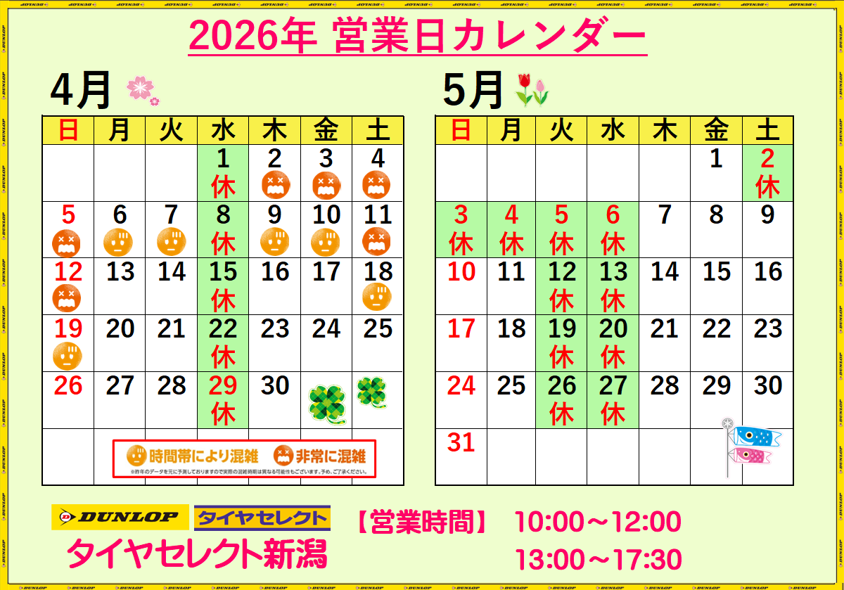 2026年4月定休日のお知らせ!!