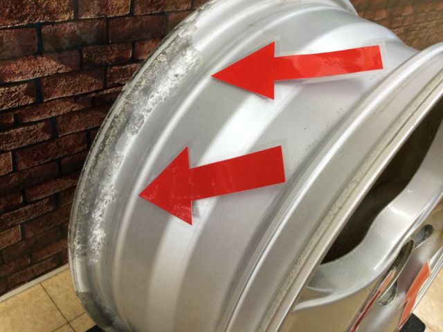 使用年数が経過し、交換が必要な状態のアルミホイールを展示してます。