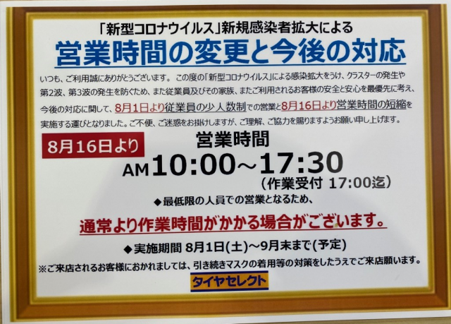 8/1より従業員の少人数制での営業、8/16より下記の時間(10:00~17:30)での短縮営業を実施する運びとなりました。ご不便、ご迷惑をお掛けしますが、ご理解、ご協力宜しくお願い致します。