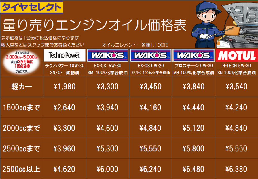 オイル価格変更となります こんにちはタイヤセレクト上越です('ω')ノ 本日はオイル料金変更のお知らせとなります! 【変更日】 2023・2・1~ 変更後の料金表は上記の写真となっております。よろしくお願いいたします。 2023.01.23