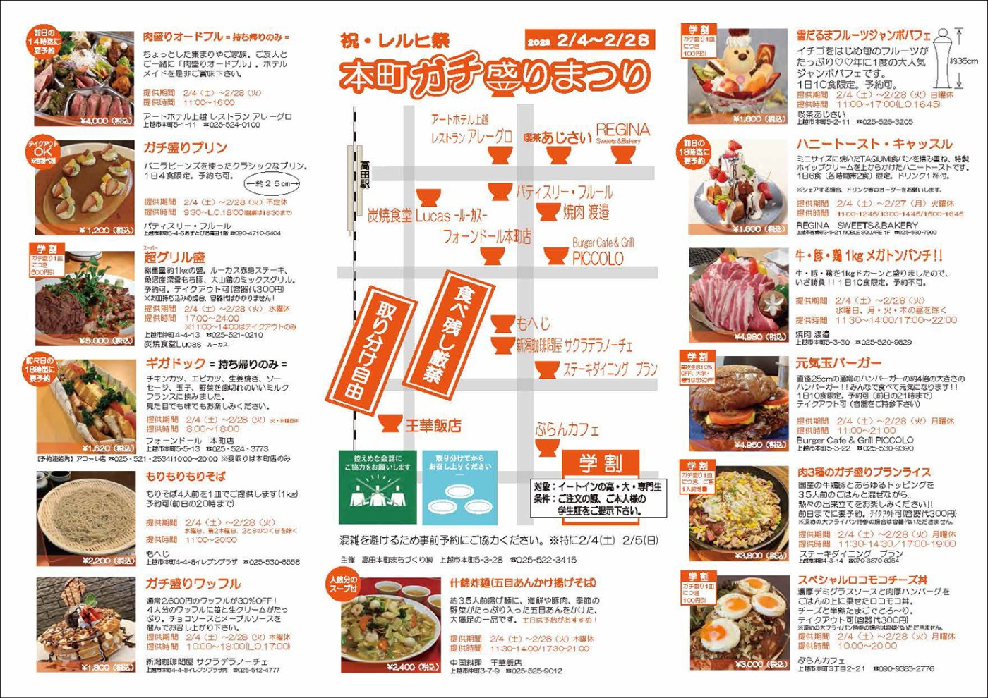 ■内容 新潟県上越市の冬のまつり「レルヒ祭」に合わせて、 高田本町商店街の飲食店を中心に、それぞれ店自慢の人気メニューを通常の3倍以上の量で提供(; ・`д・´)