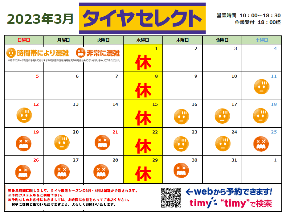 3月定休日のお知らせです。 3月4月は履き替えのシーズンとなり混雑が予想されますがご理解の程お願いいたします。