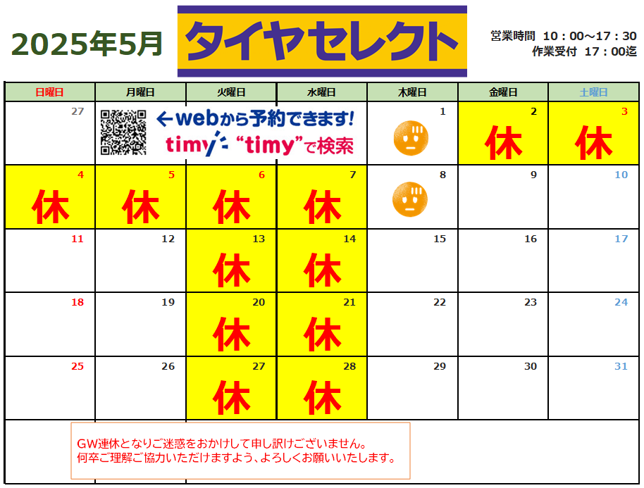 5月定休日のお知らせです。 連休が続いてご迷惑をお掛け致しますが何卒よろしくお願い申し上げます。