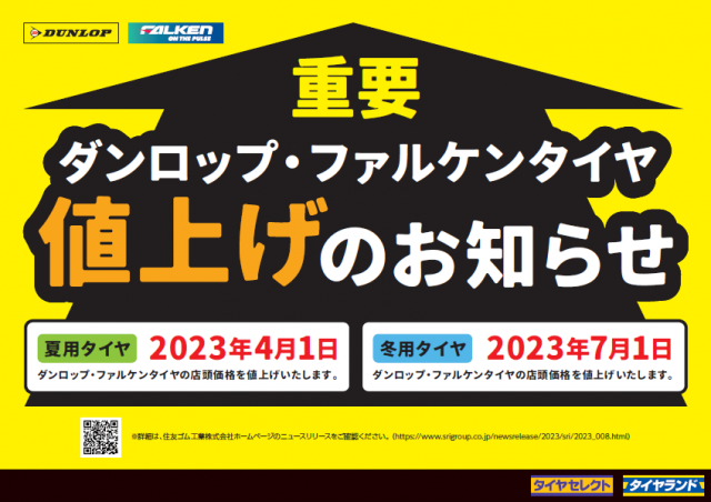 こんにちは!タイヤセレクト上越です(^^) 本日は重要なお知らせになります。 ダンロップ、ファルケンタイヤが値上がりいたします。 ・夏用タイヤ2023年4月1日~ ・冬用タイヤ2023年7月1日~ 詳しくは住友ゴ...