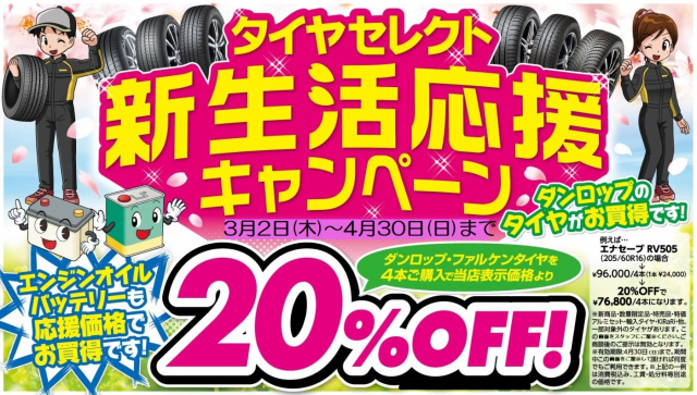こんにちはタイヤセレクト上越です('ω')ノ 本日は春のタイヤ安全点検キャンペーンのお知らせです。 【期間】 2023.4/8(土) ~2023.4/23(日) 期間中タイヤ点検実施にて、もれなくDUNLOPオリジ...