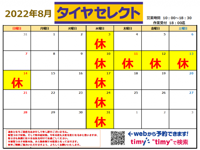 こんにちは、タイヤセレクト上越です!(^^)! 毎度ご利用いただきありがとうございます!! 当店は誠に勝手ながら8月10日から14日まで夏季休業とさせていただきます。 15日から平常通り営業致します。 お客様には大変...