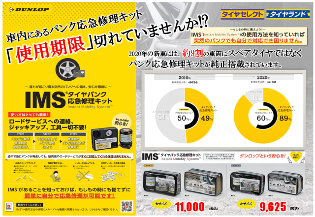 こんにちはタイヤセレクト上越です٩( ''ω'' )و 2020年の新車には、約9割の車両にスペアタイヤではなくパンク応急修理キットIMSが純正搭載されています。 ですが・・・応急修理キットにも有効期...