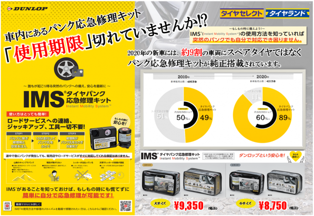 2020年の新車には、約9割の車両にスペアタイヤではなくパンク応急修理キットIMSが純正搭載されています。 ですが・・・応急修理キットにも有効期限があるのはご存じでしょうか? いざという時の為に事前にご確認くださ...